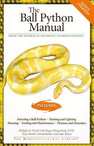 AVS The Ball Python Manual. The Ball Python appeals to enthusiasts for many reasons it's form, color, and pattern are attractive in a way that is distinctively African; it doesn't attain a size that is a problem to maintain; and it readily becomes tame and easy to handle. But for all of these pluses, caring for a ball python can be quite challenging. The Ball Python Manual is filled with the most up-to-date information on selecting, acclimating, housing and maintaining this fascinating snake. You'll also find information on husbandry and propagation of this often misunderstood species, including tips on how to overcome problems with feeding and diseases. The highly acclaimed Advanced Vivarium Systems TM books, founded and guided by herpetocultural pioneer Philippe de Vosjoli, are the #1 books on reptile care. From choosing a pet and selecting a veterinarian to feeding, housing, breeding, and more, these books deliver the most helpful and up-to-date information available on popular reptiles and amphibians kept as pets. Size: 88 pages