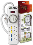 Replace the tangle of wires and timers behind a reptile terrarium with a single safe power strip featuring built in control. Spin the handy dial to set on/off times for four plug-in devices, while simultaneously powering four devices that run constantly. Ideal for cycling lights and heaters to replicate the natural day/night sequence that promotes reptile health. The precise analog control is adjustable to 15-minute intervals. This ruggedly built, UL listed device is backed by a 12-month warranty.